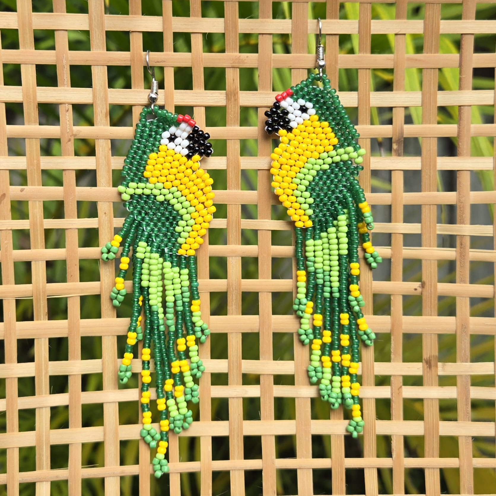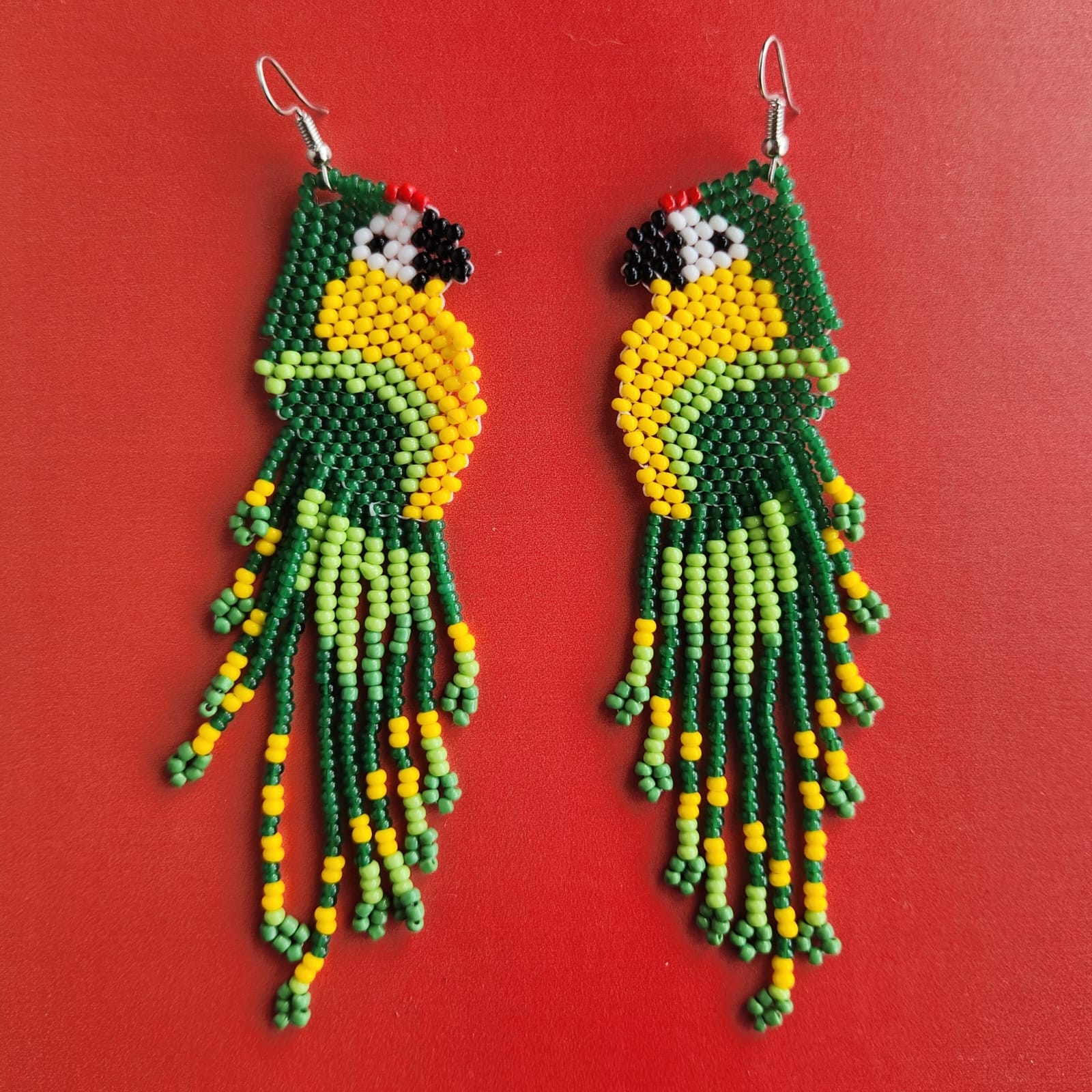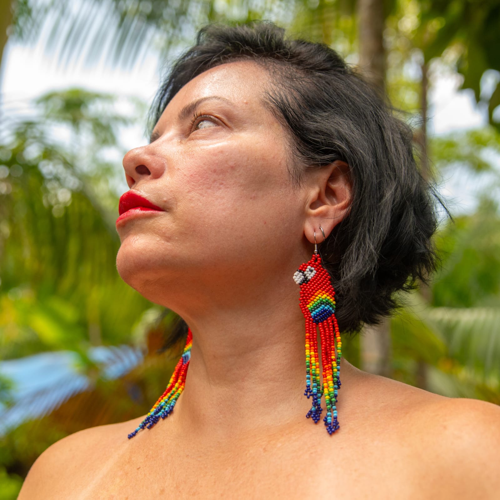 Feel like you are in the middle of the Rainforest with these macaws flying around your neck! The vibrant colors and intricate design of these macaw earrings will transport you to the heart of the Amazonia. Made by hand by an amazing artisan from Belem, these earrings are both a statement piece and an unique addition to any outfit.