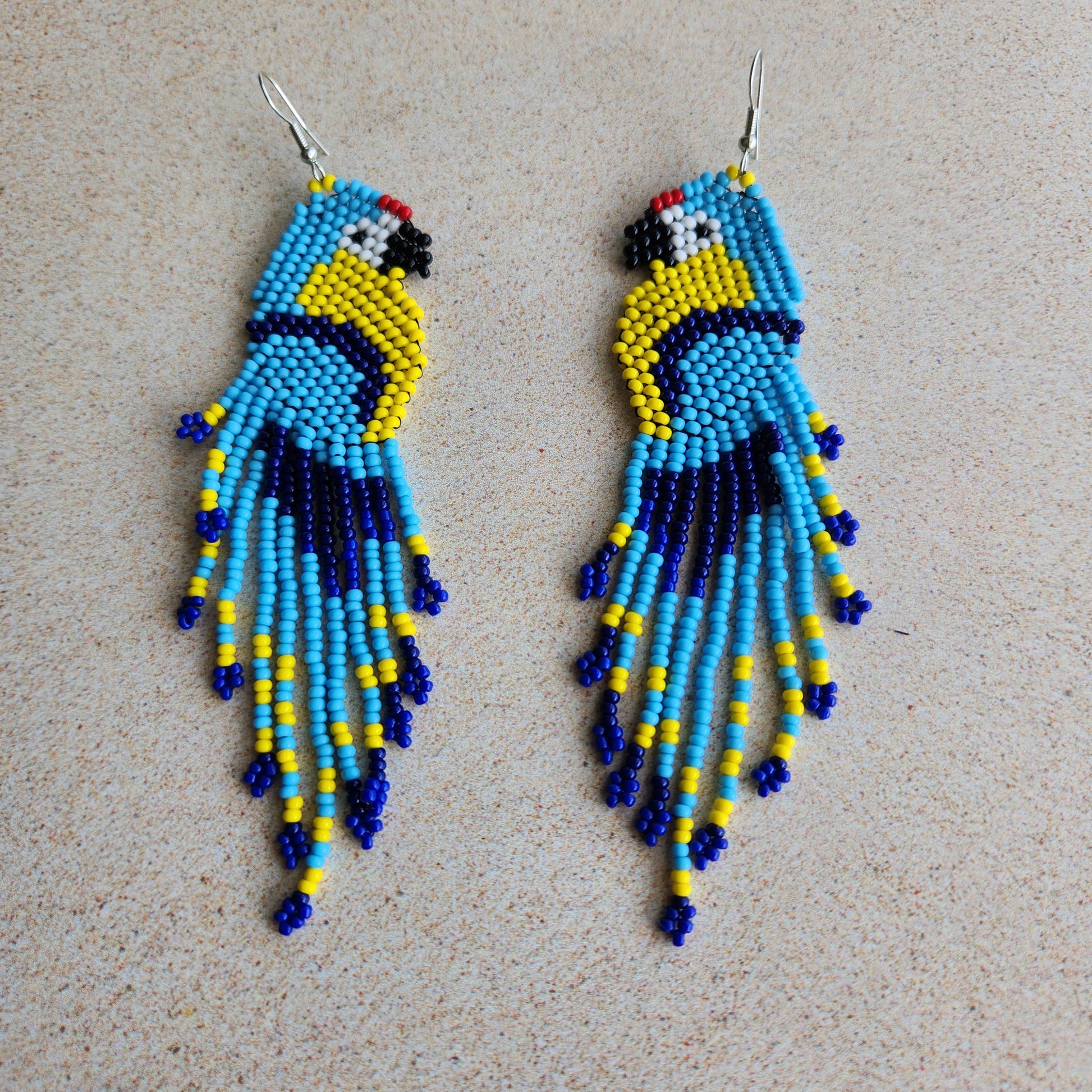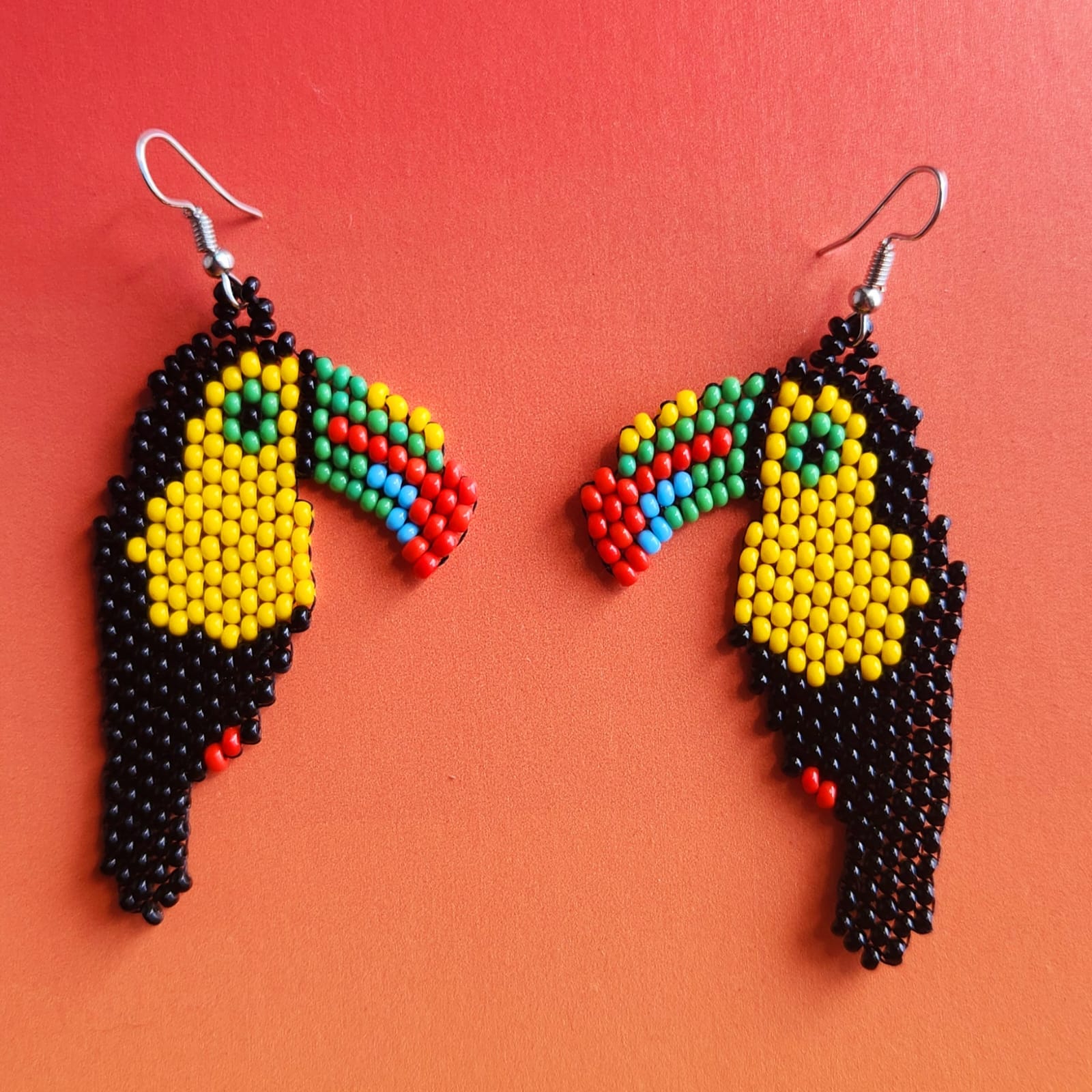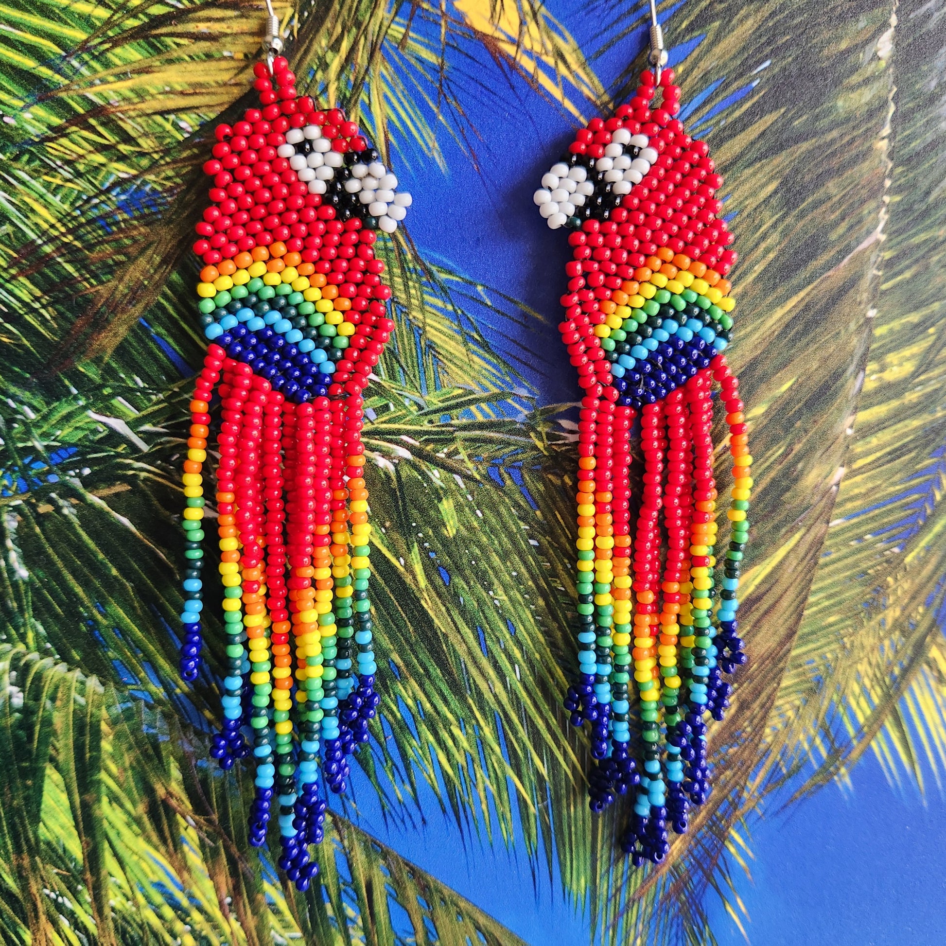 Feel like you are in the middle of the Rainforest with these macaws flying around your neck! The vibrant colors and intricate design of these macaw earrings will transport you to the heart of the Amazonia. Made by hand by an amazing artisan from Belem, these earrings are both a statement piece and an unique addition to any outfit.